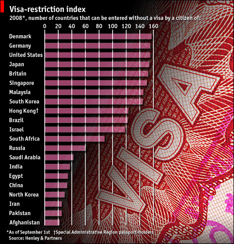 DANES faced the fewest restrictions on travel in 2008: they were able to visit 157 countries or territories without a visa according to an annual report by Henley & Partners, a consultancy. The Irish, Finns and Portuguese were only marginally less welcome abroad, with visa-free travel available to 156 countries. Those with the least freedom were citizens of countries suffering from war, terrorism or repression. South Koreans could visit 144 countries, whereas North Koreans could visit just 29 countries—if only their government would let them out.